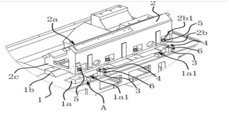 图中,1、下座体;1a、固定部;1a1、挡肩;1b、前固定部;2、上座体;2a、床身倾斜面; 2b、连接部;2b1、安装槽;2c、前连接部;3、定位块;4、定位螺栓;5、固定螺栓;6、连接螺栓。