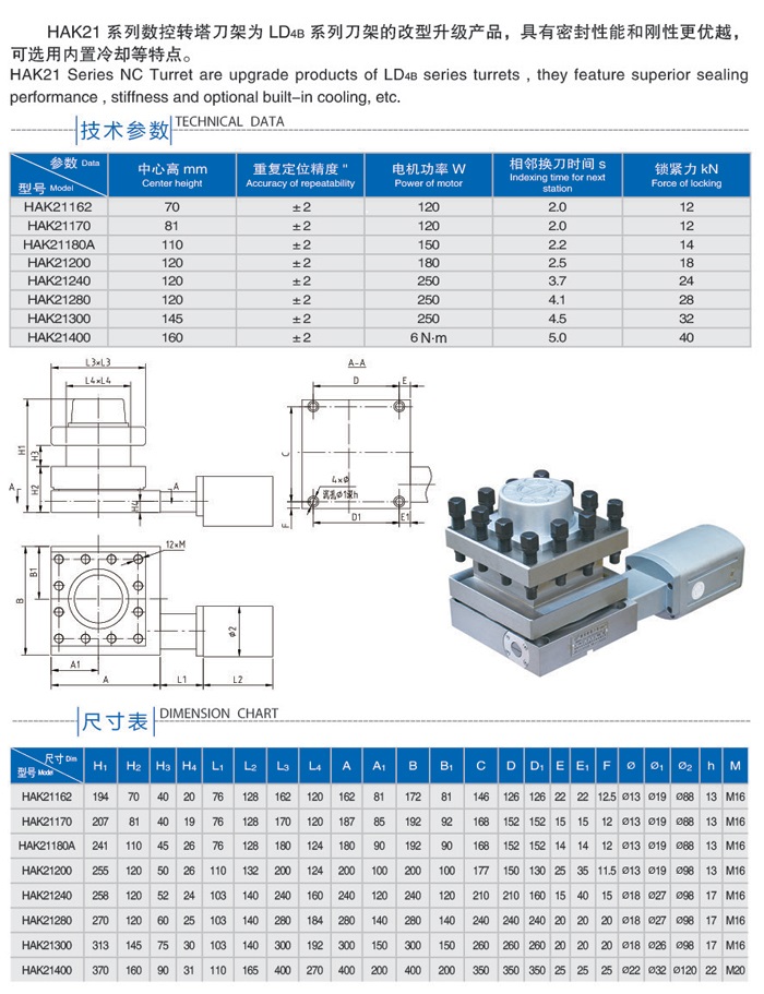 简要描述:HAK21系列数控转塔刀架为LD4B系列刀架的改型升级产品,具有密封性能和刚性更优越,可选用内置冷却等特点